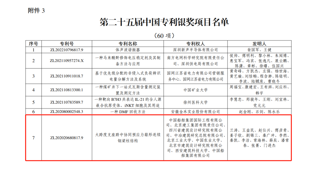 今年6月,國家知識產權局公布第二十五屆中國專利獎授獎決定,由中船集團旗下中船國際工程主導申報的專利《大跨度支座跨中協同預應力箱形連續鋼梁柱結構》(專利號:ZL202020680817.9)榮獲本屆中國專利銀獎。該獎項由國家知識產權局與世界知識產權組織聯合設立,是我國專利領域的最高榮譽。今天,讓我們走進中船國際工程鋼結構工程設計與研發團隊,聆聽他們的奮斗故事。
